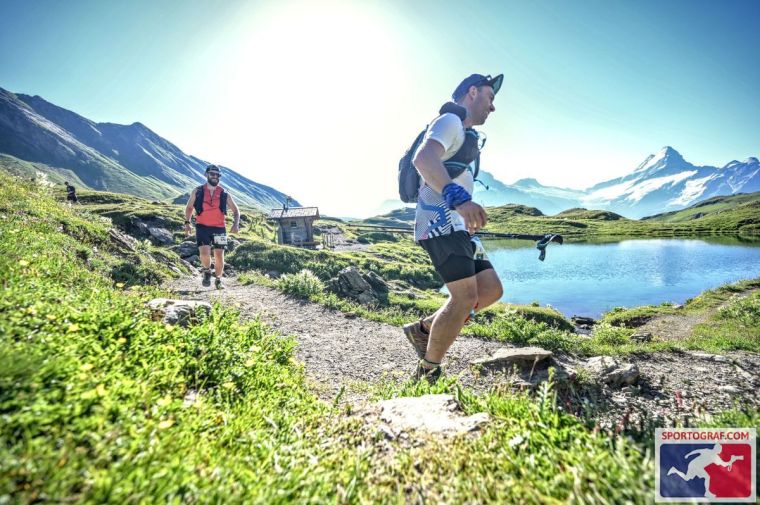 This aid station was slightly larger than the two before and we took a few extra minutes to eat, acknowledging we were all hungry, and to apply more sunscreen. We chatted to another Irish Paul, enjoyed the view and then set off towards Faulhorn. Just as we set off once more Maarten provided the energy and gave us a mid-morning boost. From here we had clear views of the trails we’d run and could see Faulhorn off up in the distance. Faulhorn would be the highest point on the race at around 2,644m. The tracks were once more very forgiving and were long gentle gravel tracks. Once more, as I was sure it would all day, the Eiger stood proud and prominent watching our progress.