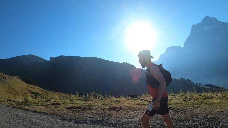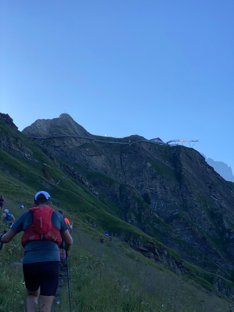 As we climbed, we started to leave the trees behind and the mountain started to open up and we could look back and see the sun rising over the Eiger and the tail of runners climbing both ahead and behind us. It was a surreal view. We then soon arrived at the first aid station which had a very narrow setup and led to the runners being funnelled, but it had everything we needed. A quick top up of water and we continued on.