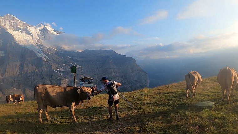 Now, on the ‘second section’ of the course we had our first chance to run and move at a comfortable pace as the trails opened up on the mountain. We rolled along enjoying the incredible panoramic over Grindelwald with the majestic Eiger standing prominent behind the town. The sun was now up and the moon was fading.