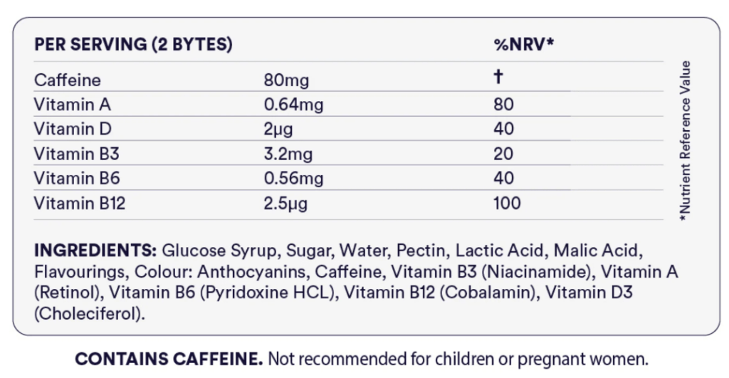Energy Bytes is a small and recently formed company. On their website you can read about their journey and how these gummies came to be – https://energybytes.co/pages/our-story As of 2024 there are 4 different flavours of gummies available: Berry Blast, Atomic Apple, Wild Strawberry and Orange Crush. The gummies themselves are soft sweets, kind of like a more tender version of a classic fruit pastel. They may be small, but they are mighty with 40mg of caffeine per gummy. This is slightly more than a typical 330ml can of coke, half a strong espresso and about a quarter of the caffeine you can expect to find in a leading brand of caffeinated energy drink. This is also about 10% of the safe daily intake recommendation for caffeine (according to BUPA). So it’s strong, but not strong enough for a single gummy to be causing any worrying side effects.