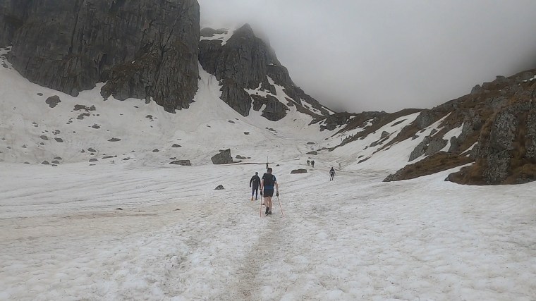 Up top, once conquered, it was a case of traversing more long snow fields as we made the way back towards Omu for a second summit. This time it started to get very steep. There were lots of runners up ahead in the distance. I managed to get passed some who didn’t have spikes and were struggling in the snow. Before the steepest part of the climb it started raining. It only rained for about 20-30 minutes but it was enough to dampen the mood. I thought that might be it and that it would rain non-stop as storms were forecast for later in the day.