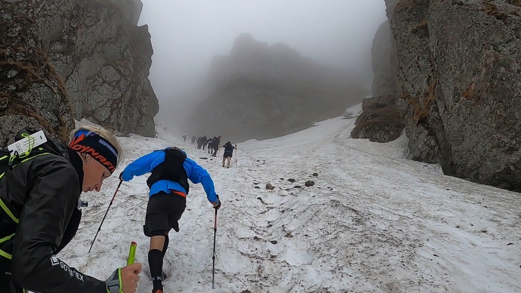 From the aid station the climbing started straightaway. First easy along some rocks then long, slow treks along the snow fields at Tiganesti. I remember commenting how still everything was. The air. The sounds. It was like a vast emptiness. Just nothing. It was ever so peaceful and strangely hypnotic. We saw a paw print that we hoped was a bear (I did want to see one!). We were edging closer to the infamous Hornul Mare chimney (the iconic line up to Omu from the Malaiesti Valley). It’s notorious for its steep, difficult ascent with a gradient close to 50degrees. No picture will do it justice.