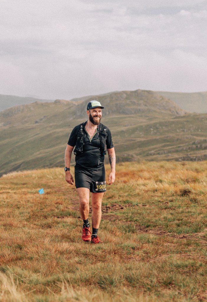 The climb was steep and slow going. Me and Matt plodded on gently consistently moving onwards and upwards thanking the marshal as we went. We were passing runners who were struggling in the heat, although thankfully the cloud cover prevented the sun penetrating us and the mountain wind provide a beautiful cooling sensation. Up top we descended. It was long and steep but far nicer than the earlier descent from Stickle Tarn. It wasn’t too long either as we had another little climb followed by some undulating trails and false summits before we reached Fairfield (Turning off just before the summit). Along the way Jake popped up once more, this time at least the clouds started to clear a little.