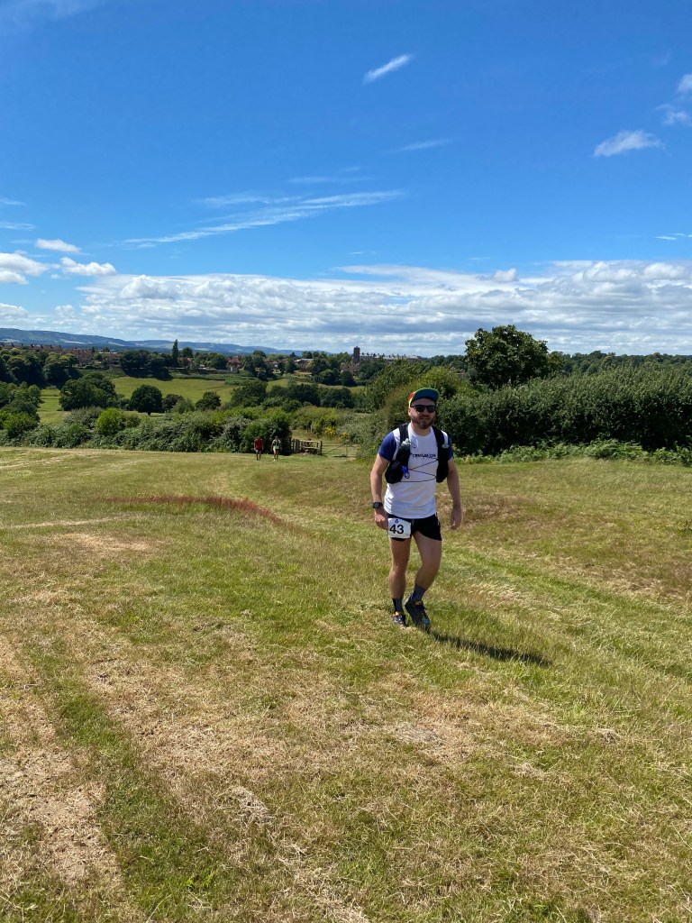We started to spread out a little after this as Gif dropped back and Jon and Reka raced on ahead of me in the middle. I was struggling to keep Jon and Reka in my sights. event though it was so open and bare on top (with little shade from the midday heat that was picking up). As we followed a sharp turn, looking back we saw incredible views as far back as Roseberry Topping and around the the u shape of the horse shoe which we’d run. It was a beautiful sight. This was a welcome distraction as it was very dusty on the ground and my leg was now hurting quite a bit.
