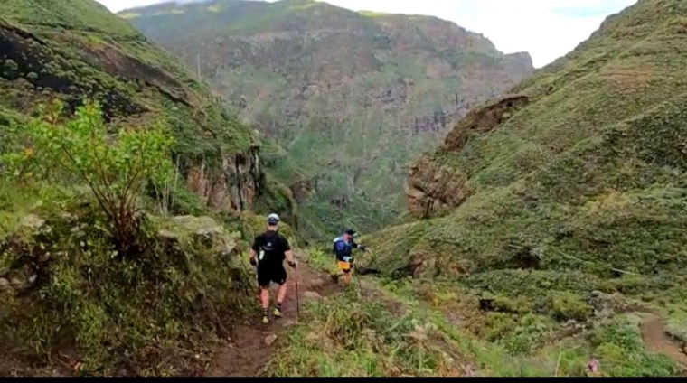 The ‘middle’ marathon quickly went downhill and our mood first started to dip when on the climb to El Hornillo as we were merged with the lead runners from the Advanced Race. All fresh and trying to run past on the narrow trails which made for a very stop start climb and chaos at the aid station. That mood was worsened with some of the route changes (since the 2019 edition) making for a far less enjoyable descent into Tejada. It felt longer and steeper, although it probably wasn’t. We took some ‘back tracks’ weaving through some housing and stayed away from the flatter main road which I previously used. The climbs were mostly behind us now as we navigated towards Roque Nublo and we tried to calculate how much longer we’d me out for. We were slower over the second marathon for sure, but nothing drastic.