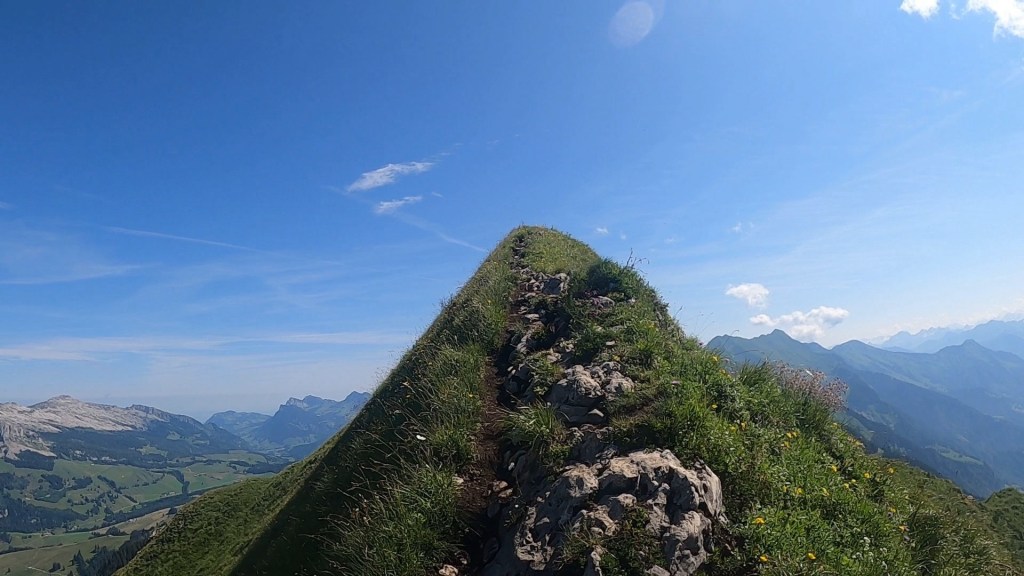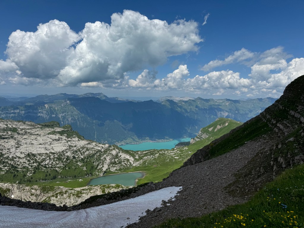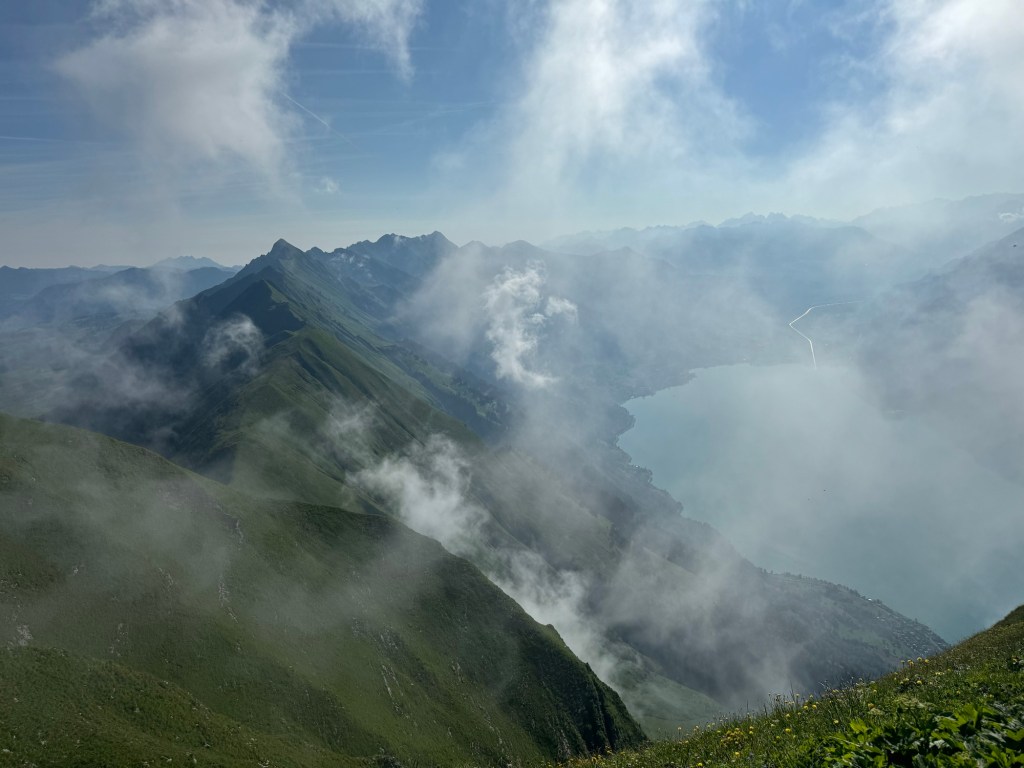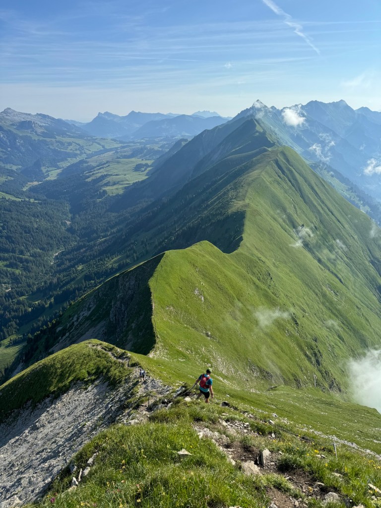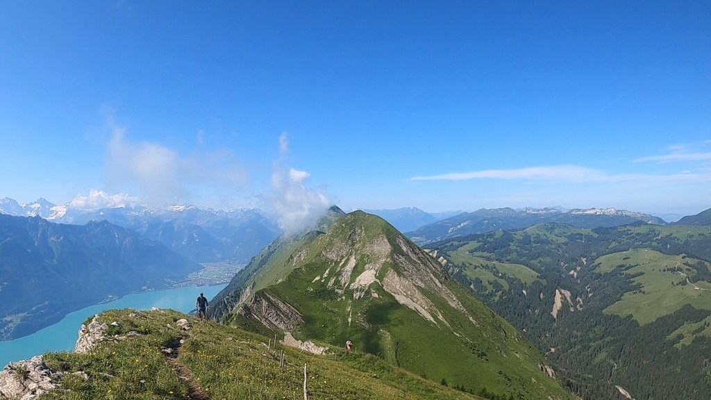 It’s hard to say for certain which memories and pictures correspond to which peak on the ridge. I do recall though that we passed plenty of hikers along the way, many doing it in reverse having taken the train up from Brienze and hiking back towards Augstmatthorn. One couple were lovely to chat with and I had a great conversation with the lady about the vibrant wild flowers all along the ridge. She told me to “take as many as I could and keep them in my heart”. I thought this was a beautiful sentiment. I also recall one particularly difficult descent which required scrambling down on all fours. For much of the ridge I kept my poles tied away in my pack and relied more heavily on my hands and having more points of contact with the ground.