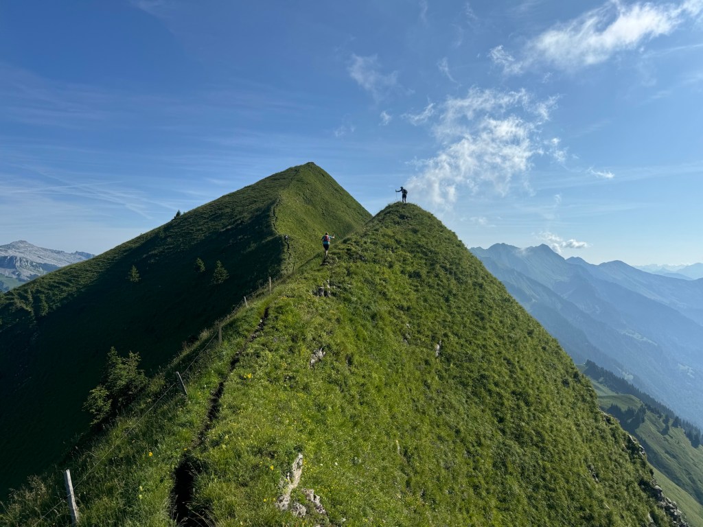 It was beautiful seeing the sunrise through the forest and the morning mist giving way to these epic summits stretching way off into the distance. A long way below to your right, the lake looking like a gigantic hole in the ground. The mountain kept climbing until we reached Augstmatthorn around 14km in at some 2,100m up. Getting here we had our first taste of the ridge and some narrow sections. Many hikers stop at Augstmatthorn and make their way off the ridge. Another hiker we were talking to told us the route becomes much harder and more dangerous after this point (he had hiked it many times himself when he was younger he said). Somewhere along here there were also electric fences to one side of the trail to keep the cattle on the mountain side to the left. I know they are electric as at one point, whilst sitting down and resting, I brushed my arm against it and felt a tingle in my opposite ankle. This amused the others!