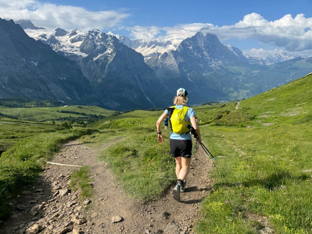 From here to the next aid station, at First, was great. It is a short section of about 6km that has some runnable trails and gentle descents and climbs. All along it are panoramic views of the mountains surrounding the Eiger. The Eiger itself was standing magnificently proud in the cloud cover across the valley. Towards the end of the section we began the long, but gentle, slow ascent to the viewpoint and aid station. As we reached the top, the route markings took us across the trail and towards the viewpoint and the walking platform. This was Natalia’s first time experiencing such a long and exposed platform so we slowly walked along it to the sanctuary of the aid station, after getting some pictures of course! At the aid station I had my own party as I sat and ate loads whilst singing to the 90s pop anthems blaring out. Even though we’d only done less than 15km I tucked into the soups and bouillon available (it’s a popular feed station on the E101 route!). Eventually though we had to carry on.