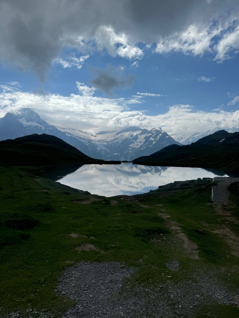 I remembered the next section as we left First and made our way towards Feld. The trails were similar to before and led us towards some amazing lakes of Bachalpsee, naturally as we ran around the lakes the views were incredible. It really is a beautiful place. I pointed out Faulhorn to Natalia, the highest point in the race way off in the distance, a tiny speck on the mountain. Along here we met some other British runners who were part of a group running from Wild Trail Manchester, the group I spent a lot of time running in London with. After the lakes we encountered a small amount of snow on the trail which made it slippery, so we climbed slowly and carefully. Some smart arse behind us tried to rush past us and slipped in the mud and slid back down the hill. Not sure what he was trying to gain. He didn’t try to go past again.