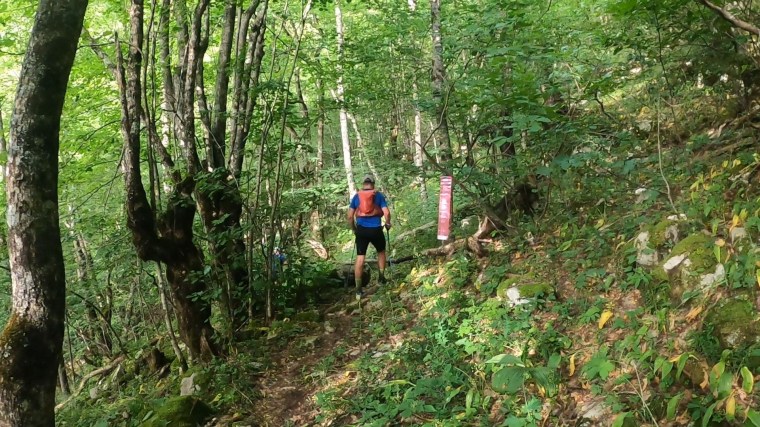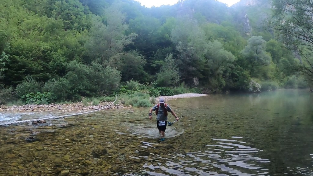 My memory of the course was a long single track climb that lead to a real dense forest where it was very soft underfoot. The floor was covered with pine needles and bounced and wobbled under our weight. Through the forest we climbed higher and higher in the humid night. It was hot and stuffy. Very hot. Somewhere the trails opened up and we had some enjoyable runnable descending for several kms mixed with a few short technical descents and bottlenecks at each. One technical section had quite a pile up as runners had to cross a fast moving river. Volunteers lit up the river with massive fires and helped ensure we all crossed safely.