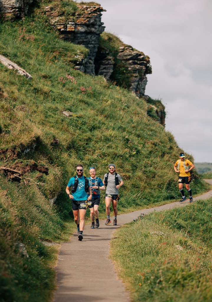 After the first climb along an open hillside we hit onto some lovely trail paths that wound back down to the coast and to the Valley of Rocks. We’d stopped by here the night before for a post meal walk. It had incredible views and the sunset the night before was mesmerising. We turned right and ran along the coast path as I continued stopping at every opportunity to kick goat shit in the direction of the others. It even earned a little laugh from a lovely old couple who stepped aside to let us pass. We were enjoying ourselves! Rounding a blind corner I stopped to wait for Nick and pretend to ‘sling some shit’ at him, as I faked the manoeuvre, to my horror it wasn’t Nick but another runner he’d let passed. Oops. I don’t think he appreciated the fright!